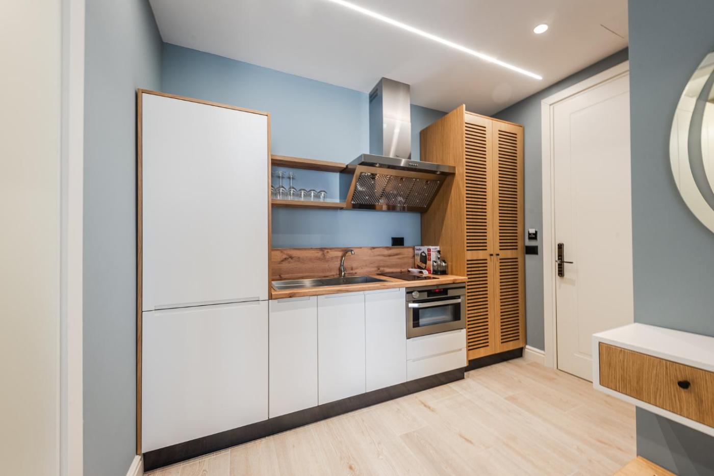 One-Bedroom Apartment. Featuring a private entrance, this air-conditioned apartment comprises 1 living room, 1 separate bedroom and 1 bathroom with a bath and a shower. Meals can be prepared in the well-fitted kitchen, which comes with a stovetop, a refrigerator, kitchenware and an oven. The apartment features parquet floors, a seating area with a flat-screen TV, a washing machine, soundproof walls as well as sea views. The unit offers 3 beds.