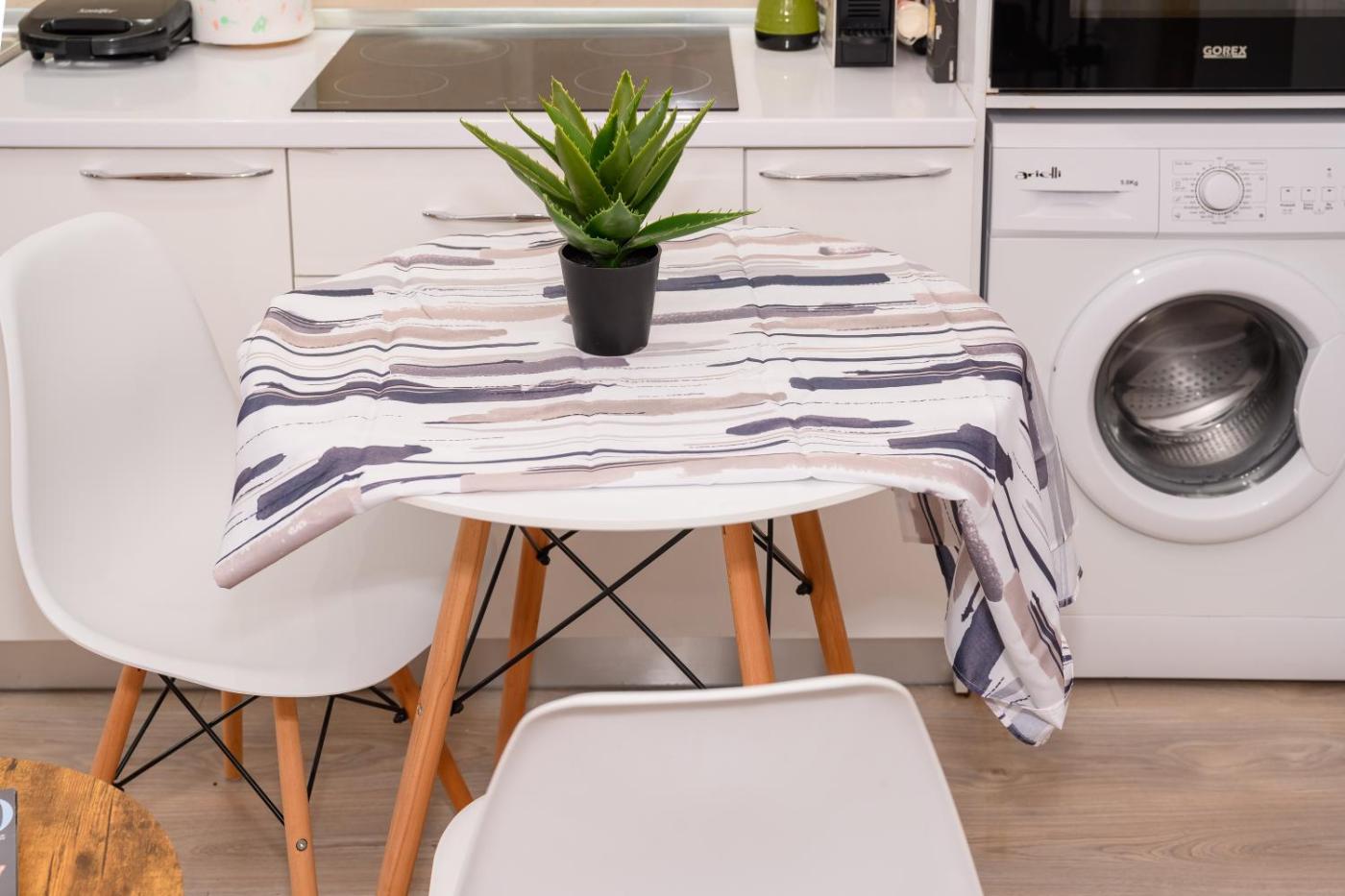One-Bedroom Apartment. This air-conditioned apartment features 1 living room, 1 separate bedroom and 1 bathroom with a bath. The well-fitted kitchen features a stovetop, a refrigerator, a dishwasher and kitchenware. This apartment has a washing machine, flat-screen TV with satellite channels, garden views, as well as winechampagne for guests. The unit has 2 beds.